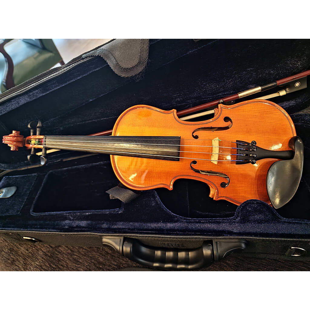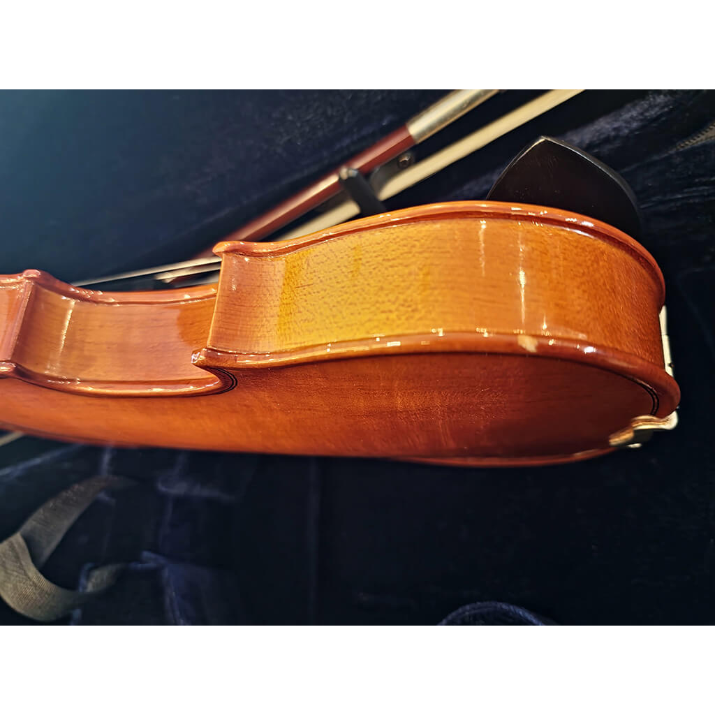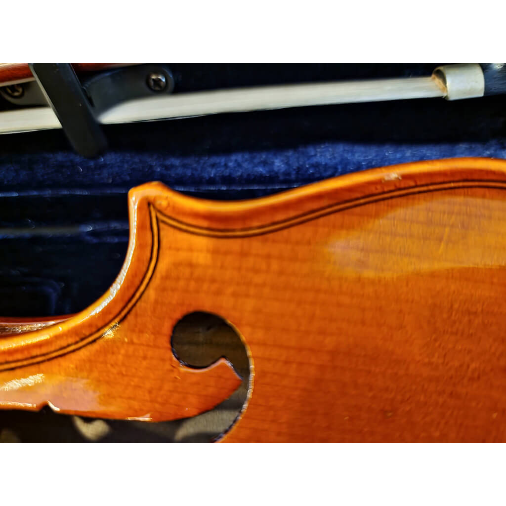 Instrumento em 2ª mão com pequenas marcas no verniz no bordo do tampo superior e inferior.