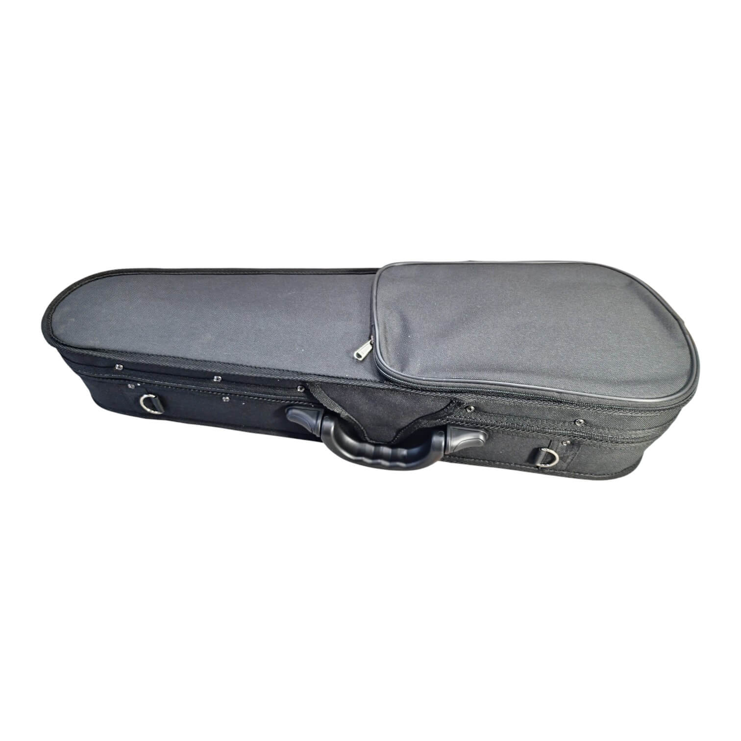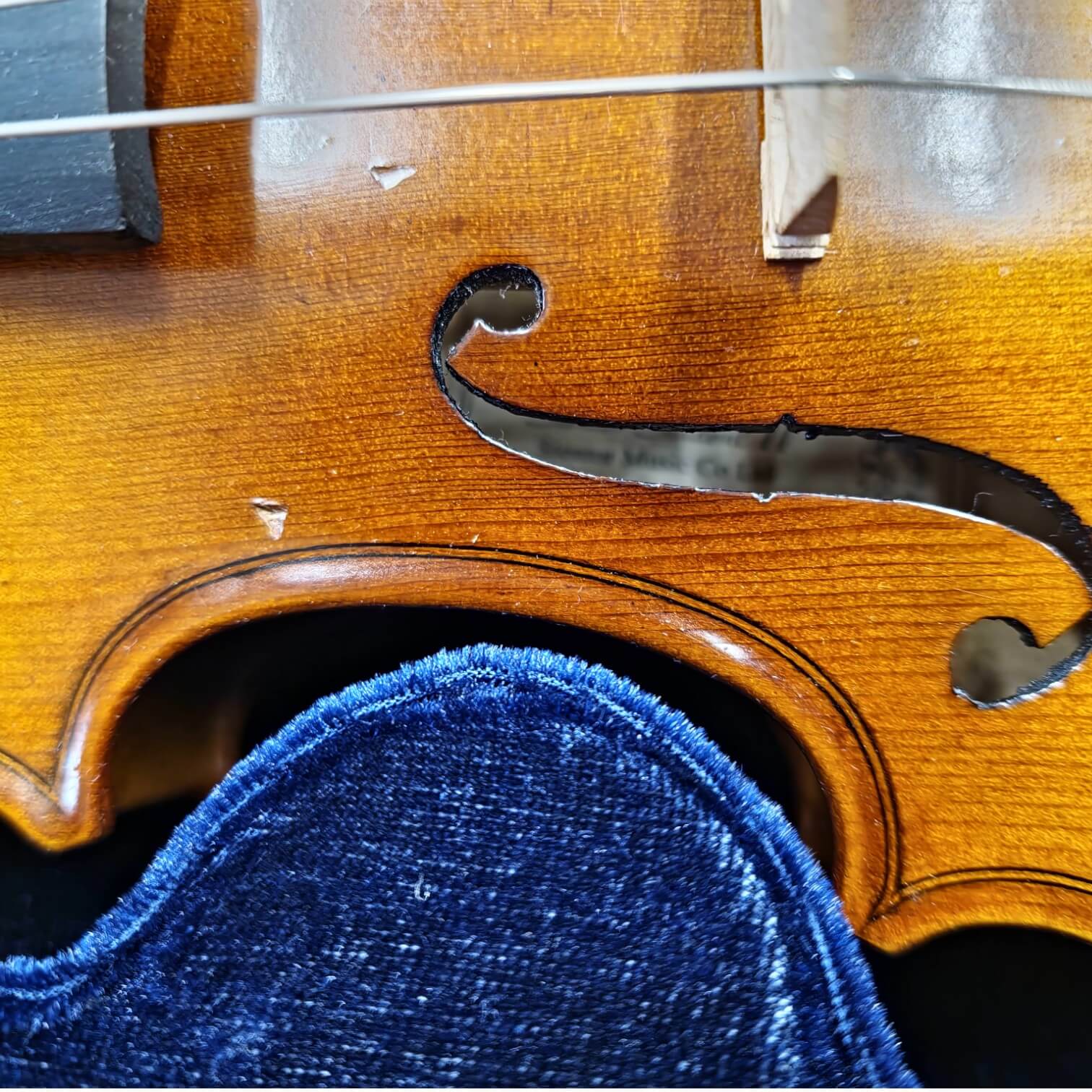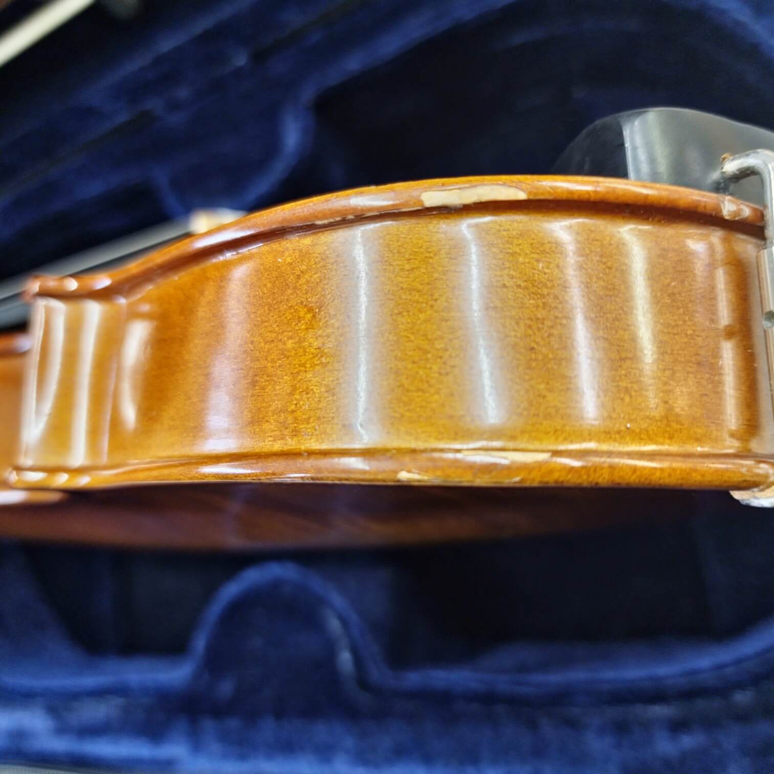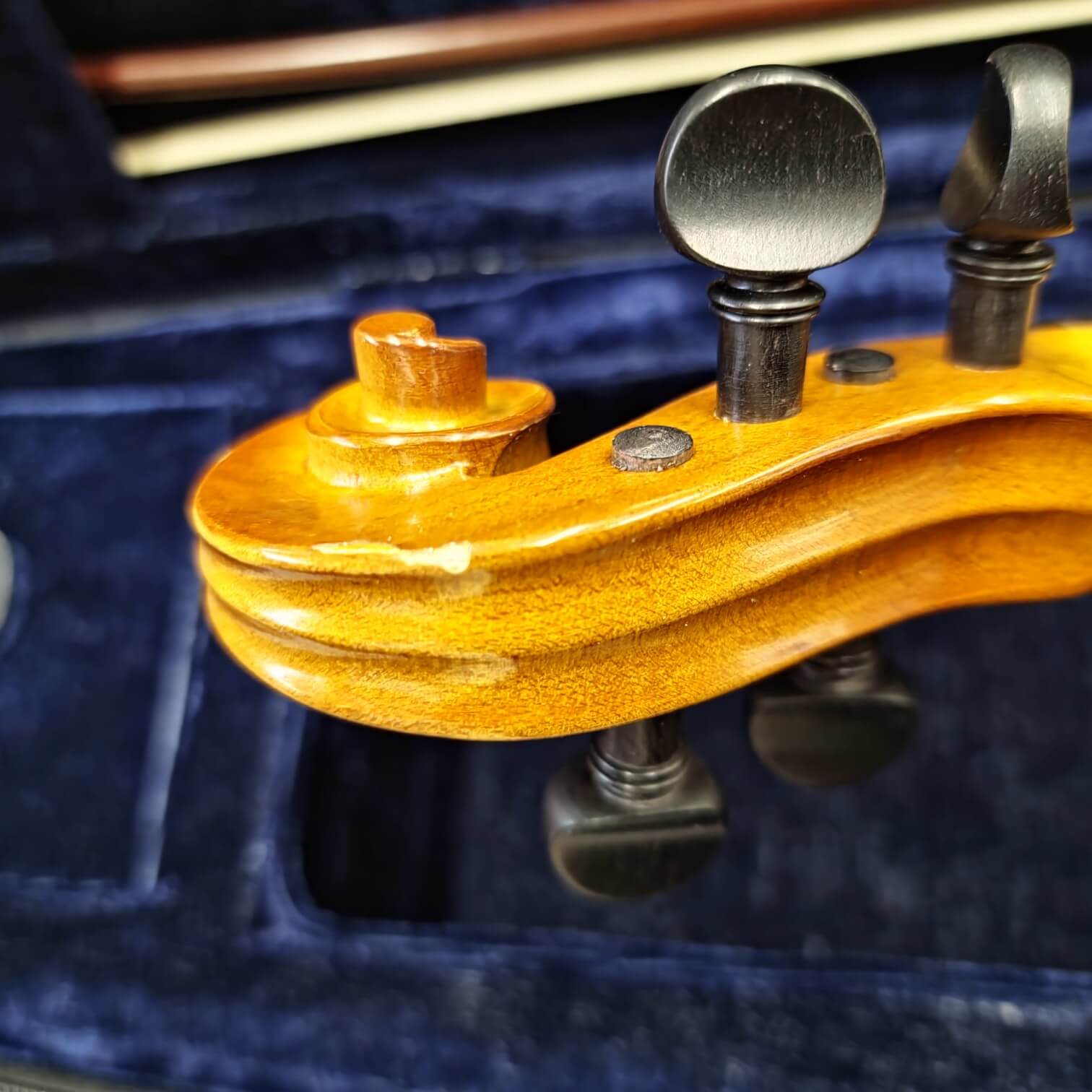 Instrumento em 2ª mão com pequenas marcas no verniz na voluta, no tampo superior perto do cavalete e no bordo.