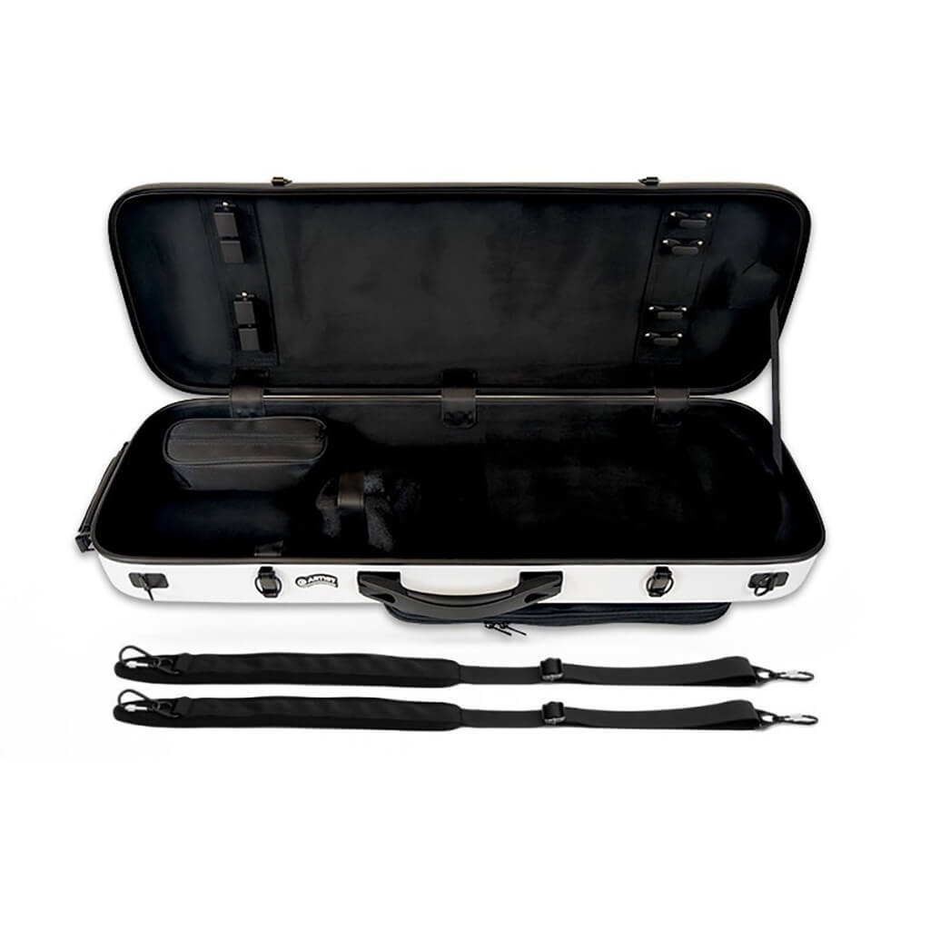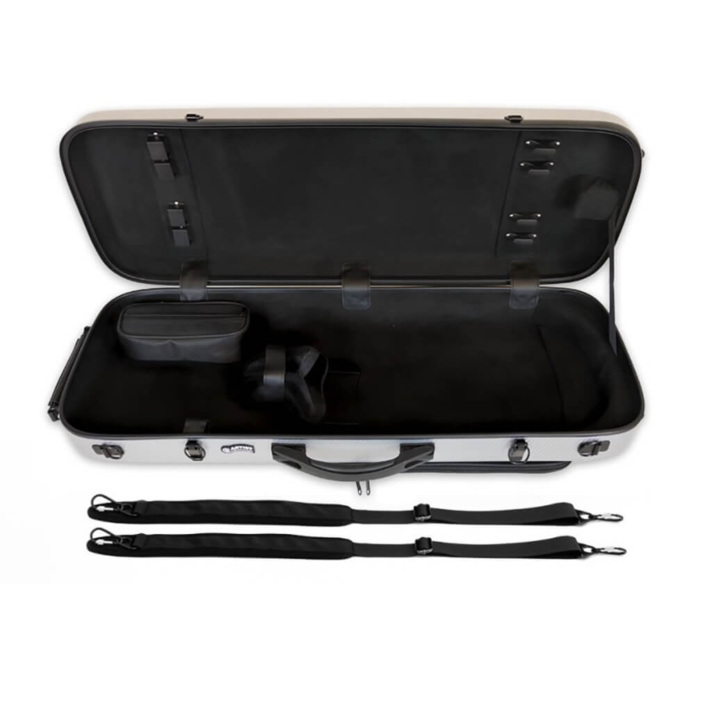 O seu interior tem espaço para 4 arcos e um compartimento para acessórios. As alças tipo mochila têm um mosquetão de segurança para transportar às costas. Tem uma alça superior tipo metro, uma alça lateral e uma bolsa de partituras amovível. O apoio do braço é regulável para poder utilizar com violas de arco desde 14” até 16,5”.